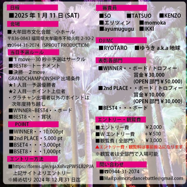 こちらは『Palm City Dance Battle Grandchampionship2024当日予選2025.1.11』のエントリー・前売りチケットとなります。