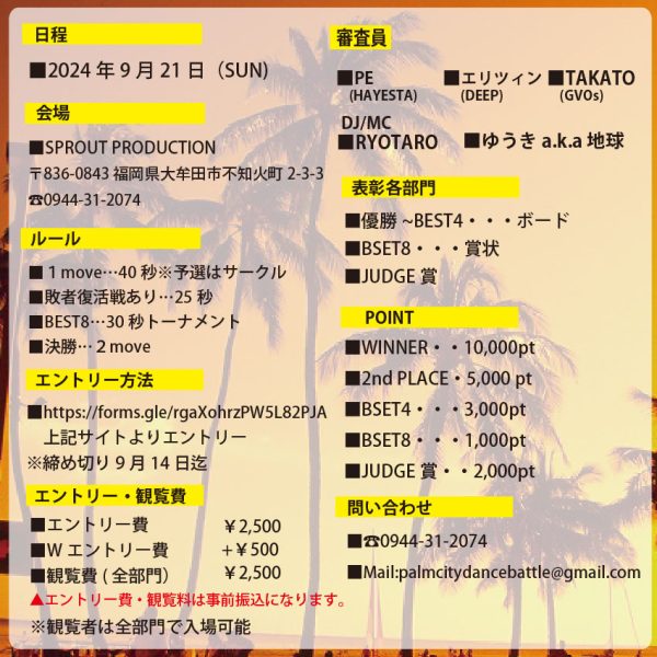 ※「palmcitydancebattle@gmail.com」よりご案内いたしますので、迷惑メール設定の確認をお願いいたします。